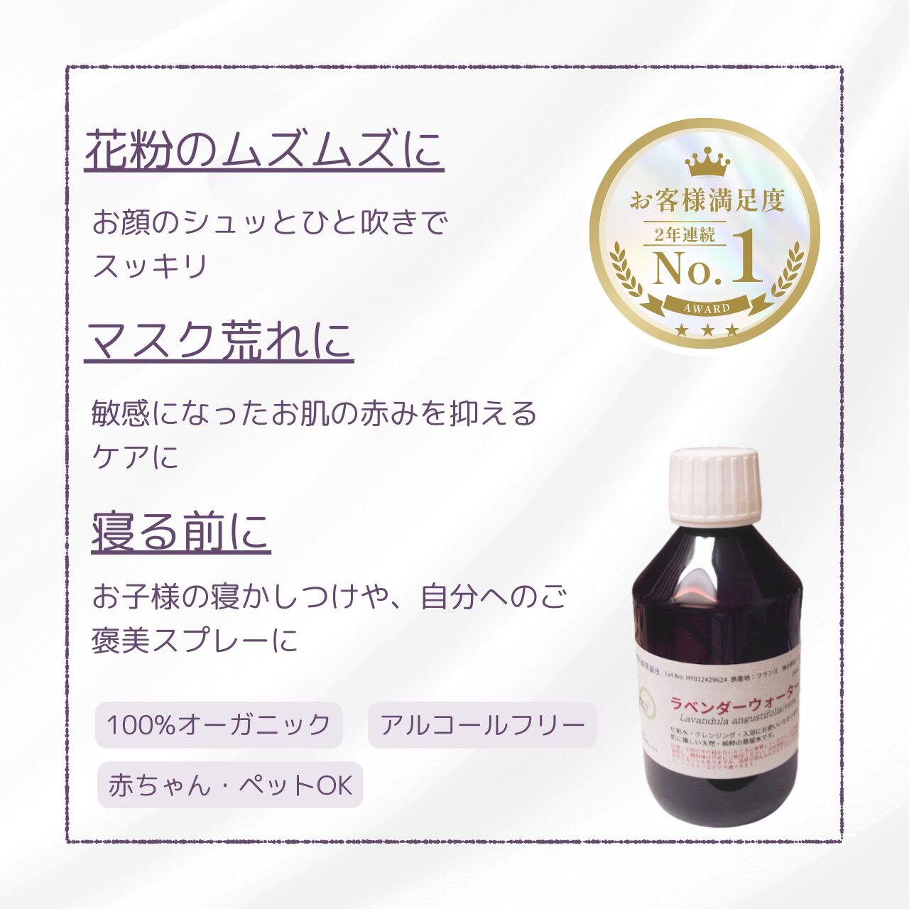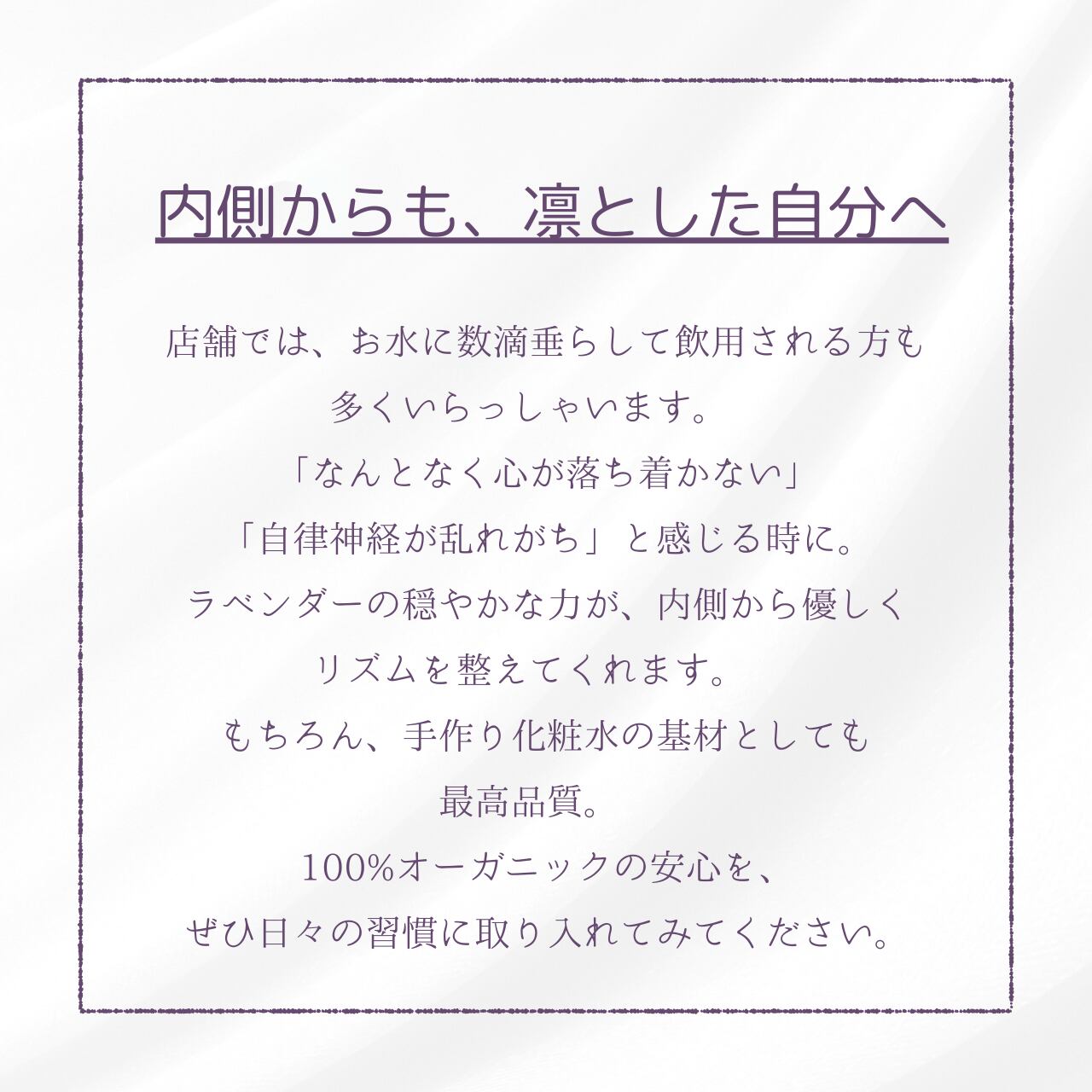 水蒸気蒸留法で抽出される精油と一緒に抽出されたもの(ハイドロゾル)です。ラベンダーの爽やかな香りが心・体・皮膚を鎮静させてくれます。スキンケアやクレンジングにご使用いただけます。